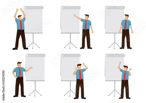 © UncleFredDesign, Obraz premium Set of businessman giving a presentation. Isolated vector cartoon illustration.