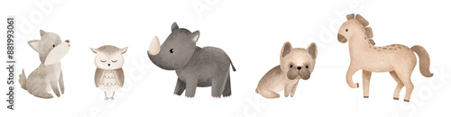 © Ekatmart, Naklejka premium Set of cartoon animals. Hand drawn illustration of beige French Bulldog and horse. Collection animal of grey color wolf and owl. Childrens clipart dark grey rhinoceros. Minimalist scandinavian style