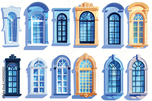 © Tanjil Hasnat, Fototapeta premium Set of cartoon elements of architecture - closed windows, front view. Vector illustration on white background.