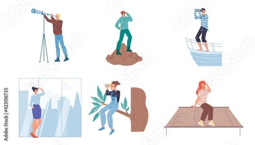 Naklejka premium Set of cartoon flat characters looking into the distance using binoculars and...