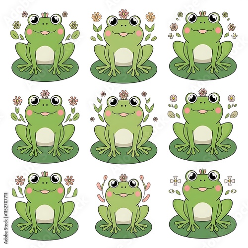Fototapeta premium set of cartoon frogs with flowers and the words frog .