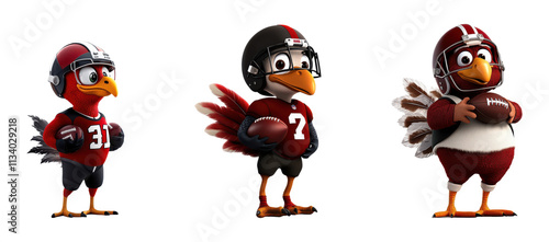 Obraz premium Set of Cartoon turkey dressed as a football player holding a football isolated on transparent background