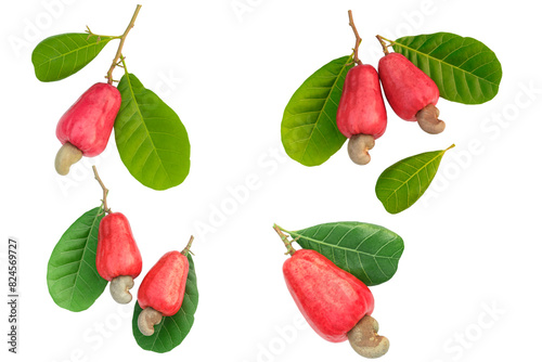 Obraz premium Set of Cashews fruit ripe with green leaf on isolated white background.