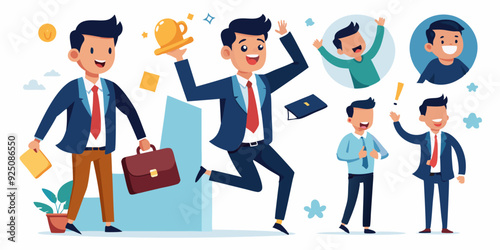 © VectorVibe, Obraz premium Set of character a businessman in different situations. The man is shocked, goes to work, happy and jumped