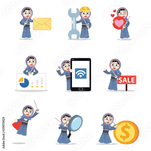 Obraz premium Set of character woman kendo wearing a mask while coaching her students.