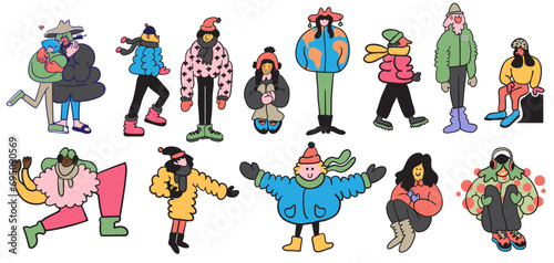 Fototapeta premium set of characters in winter clothes in doodle style in vector. People at winter.Template for postcard illustration poster sticker