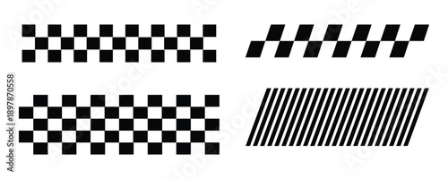 Obraz premium Set of checkered flag patterns and diagonal stripes in black and white vector graphics for racing and speed.