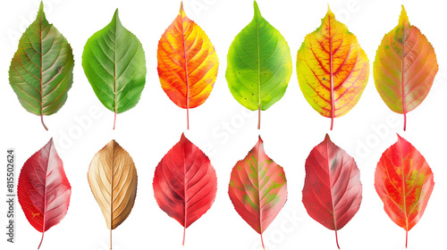 © MDNANNU, Obraz premium Set of cherry tree leaves, showing their seasonal transformation from vibrant green to fiery red,