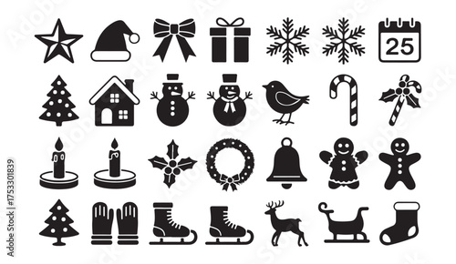 © SHUVO, Naklejka premium Set of Christmas and New Year vector icons showing snowflakes, trees, reindeer, bells, and ornaments in minimal black silhouette style
