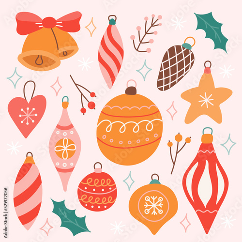 Fototapeta premium Set of Christmas tree toys, vector illustration in flat style, decor for postcards, posters