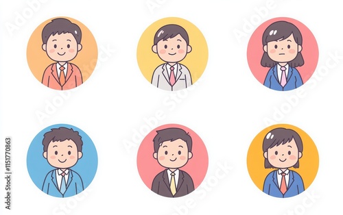 Fototapeta premium Set of circular icons with an office worker in a suit, drawn in a simple Japanese manga style.
