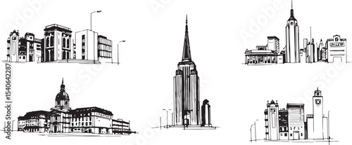 Fototapeta premium Set of city buildings. Line urban backdrop, different buildings on street,...