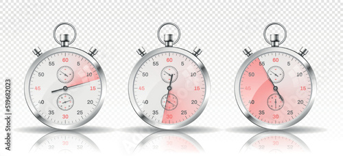 Naklejka premium Set of Classic stopwatch. Sparkly metal device, time counter with dial. Clock on copy space. Red scale indicating interval. Realistic 3D vector illustration isolated on transparent background