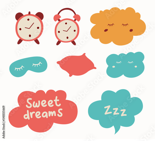 Fototapeta premium Set of clouds, alarm, pillow and sleep mask. Me time illustration vector.