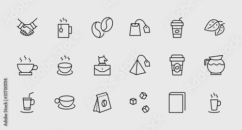 © Set Line Vector Icon, Fototapeta premium Set of Coffee and Tea Vector Line Icons. Contains such Icons as Cup of Tea, Teabags, Coffee beans and Green Tea Leaves, a pitcher of Water, Sugar Cubes and more. Editable Stroke. 32x32 Pixel Perfect