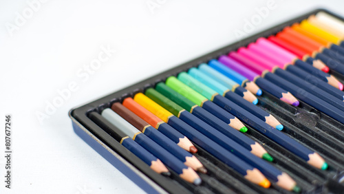 © arthierry, Naklejka premium Set of color pencils with different size in pencil case on a white background
