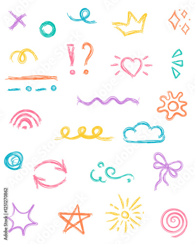 © Elena, Naklejka premium Set of Color Scribble Elements, Hand Drawn Doodles, Icon, Grunge, Scribble Drawn with Pen, Sketch