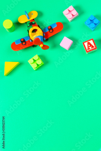 © vejaa, Obraz premium Set of colorful children toys on light green background. Top view, flat lay