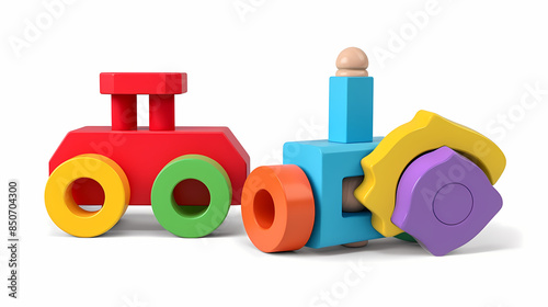 © Akharadat, Fototapeta premium Set of 3 colorful classic toddler cutout or child's toys of car wheels, xylophone and geometric cubes isolated on white.