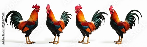 Fototapeta premium Set of colorful free-range male roosters in different poses isolated on white. Roosters with red comb, beautiful feathers. Poultry farm birds, fowl, cockerel animal in various poses. Ideal for farm,