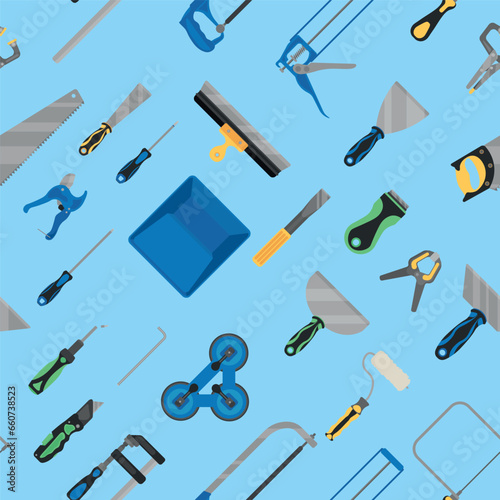 Obraz premium Set of construction tools on light blue background. Pattern for design