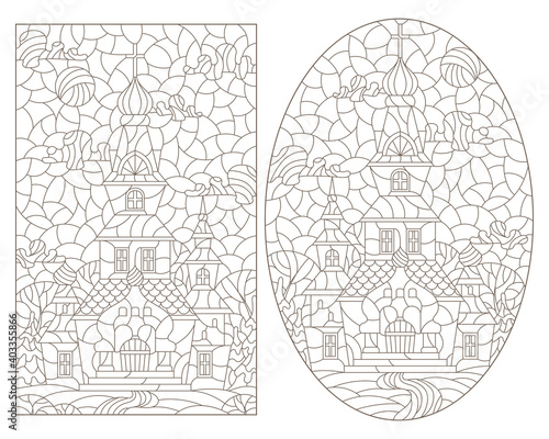 © Zagory, Fototapeta premium Set of contour illustrations in stained glass style with temples on a landscape background, dark outlines on a white background