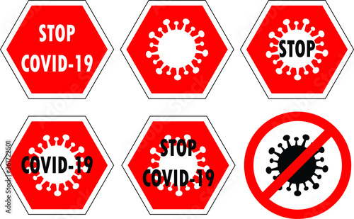 Fototapeta premium Set of coronavirus stop shape signs. Including coronavirus cell and STOP COVID-19 text. Vector illustrations.
