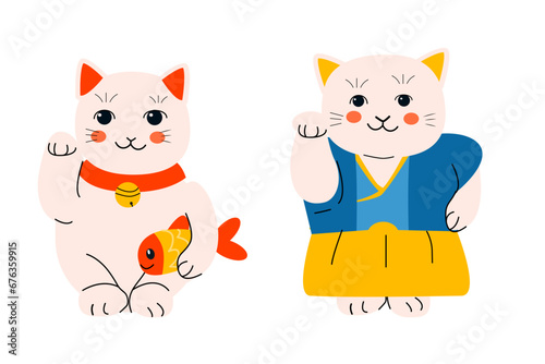 © ZhumaStudio, Obraz premium set of cute asian kitten in kimono with fish
