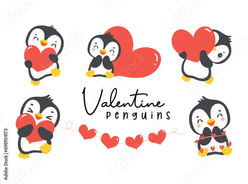 Fototapeta premium Set of Cute baby penguins Valentine with heart, romantic animal cartoon...