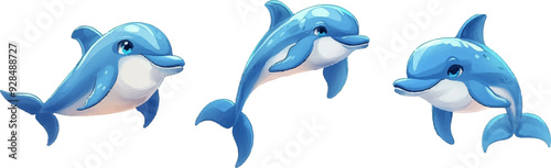 Naklejka premium Set of cute blue dolphin cartoons in various poses white background