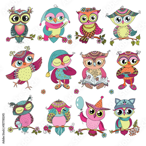 Fototapeta premium Set of 12 cute colorful cartoon owls