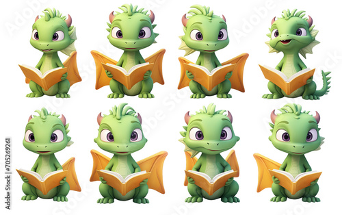 Fototapeta premium Set of Cute Dragons Reading a Book - Whimsical Delight on a Transparent...