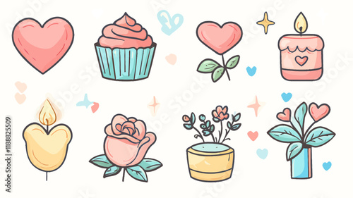 Fototapeta premium Set of cute Easter-themed icons featuring desserts like cupcakes, cakes, muffins, and candies in pink and chocolate colors, perfect for birthday, celebration, and Valentine designs