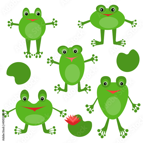 Obraz premium Set of cute frogs, positive green characters and swamp flowers