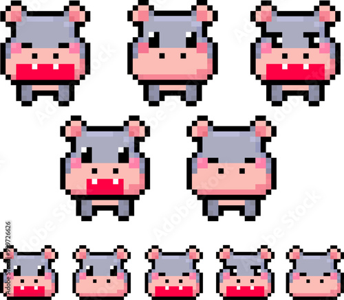 © HongSaMut, Obraz premium set of cute hippopotamus in pixel art vector