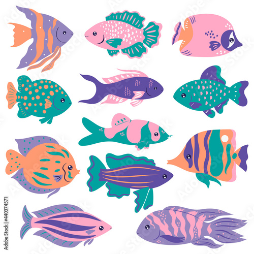 © Екатерина Зирина, Naklejka premium Set of cute oceanic fish isolated on a white background. Vector graphics.