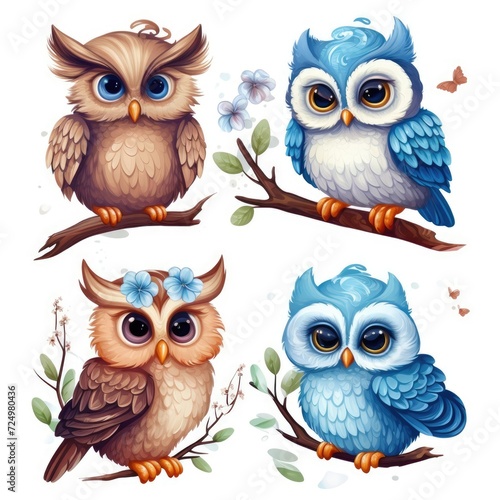 © nafanya241, Fototapeta premium Set of cute owls on white background