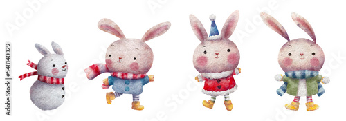 Naklejka premium Set of cute rabbits and snowman in Christmas costume clipart watercolor...
