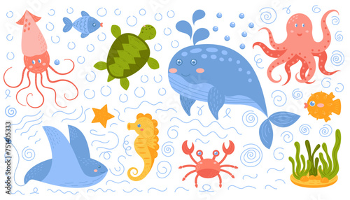 Naklejka premium Set of cute sea animal. Underwater life. Vector illustration with hand drawn elements. Cute squid, while, turtle, octopus, stingray, fish, crab, seahorse. Fish and wild sea animals isolated on white