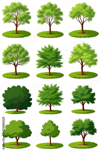 © Pushkarita, Fototapeta premium Set of different green trees with trunks and foliage illustrations isolated at white background
