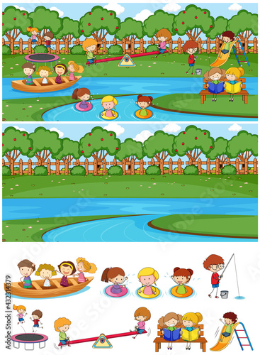 © GraphicsRF, Obraz premium Set of different horizontal scenes background with doodle kids cartoon character