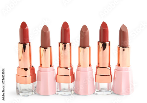 Obraz premium Set of different lipsticks on white background