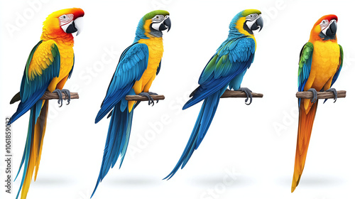 © Martinesku, Fototapeta premium Set of different macaw parrot, isolated on white background.