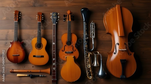 © Waqar, Fototapeta premium Set of different musical instruments on wooden background.generative.ai