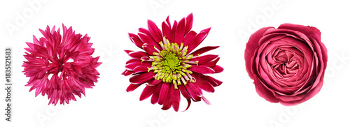© Ortis, Obraz premium Set of different red flowers (knapweed, rose, chrysanthemum) isolated on white or transparent background. Top view.