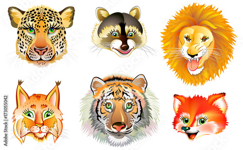 Fototapeta premium Set of different wild animals heads on white background. Vector cartoon image.