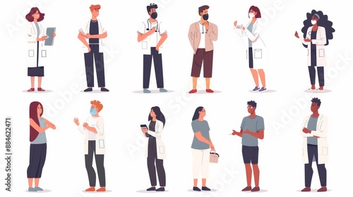 Fototapeta premium Set of Diverse Doctors and Healthcare Professionals in Lab Coats and Masks