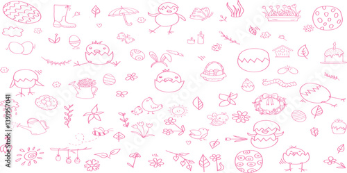 Fototapeta premium Set of doodle hand drawn elements for Easter in coquette style.