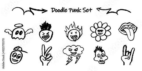 © A_Y_N, Naklejka premium Set of doodle punk head, goat gesture, cloud. Collection of vector black charcoal outline faces handdrawn humor emotions. Retro grafitti style wax pencil drawn stick out tongue, ghost with halo.