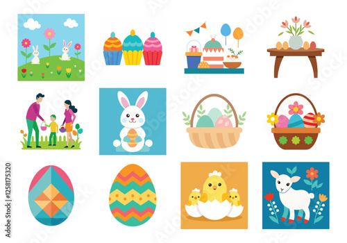 © Nazma, Obraz premium Set of Easter design elements. Easter Sunday Eggs, chicken, butterfly, rabbit, tulips bundle